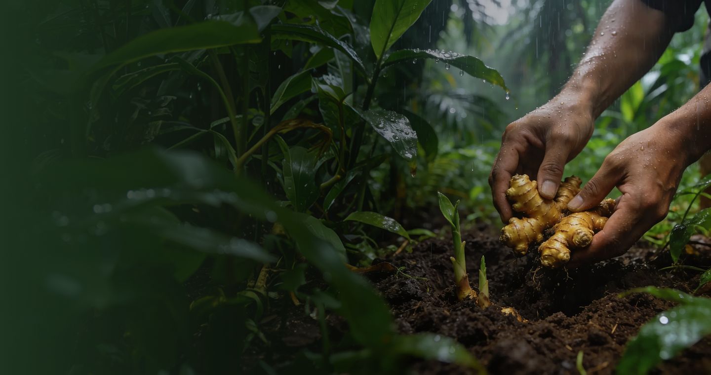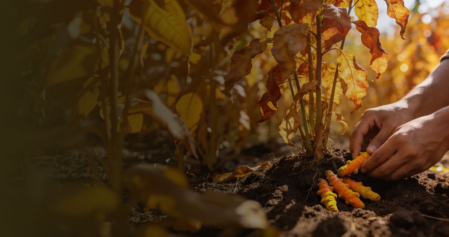 Harvest occurs only when leaves dry naturally, indicating maturity. We dig by hand to avoid damage, capturing the turmeric at its most effective stage—vital and balanced.